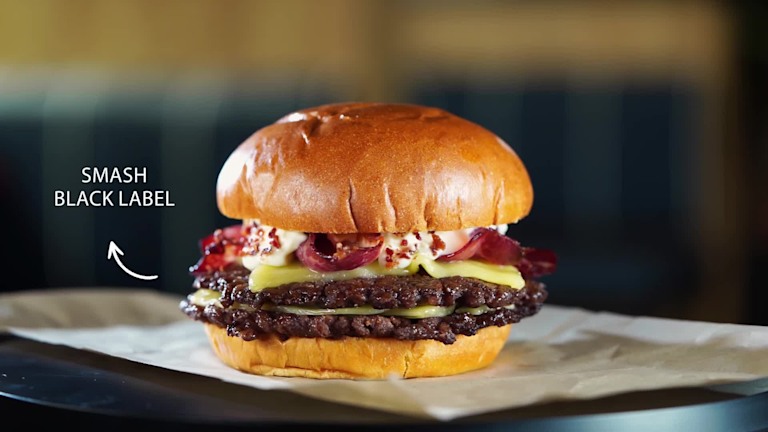 Con carne BLACK LABEL SMASH, bacon de angus, mayonesa de huevo frito, pelta ibérica, queso madurado.