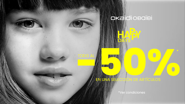 Aprovecha nuestros HAPPY DAYS y disfruta de un 50 % de descuento en una selección de artículos Okaïdi-Obaïbi.